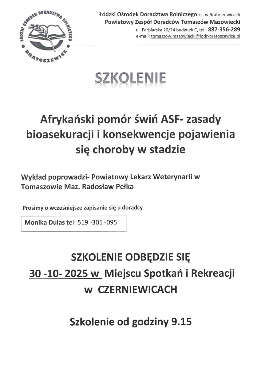 W najbliższy czwartek odbędzie się szkolenie "Afrykański pomór świń ASF - zasady bioasekuracji i konsekwencje pojawienia się choroby w stadzie. Zachęcamy do udziału. Szczegóły poniżej: