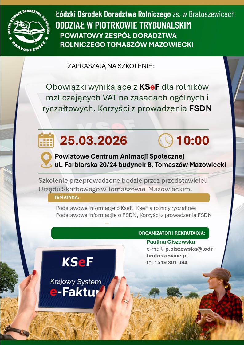 Zachęcamy do udziału w szkoleniu: "Obowiązki wynikające z KSeF dla rolników rozliczających VAT na zasadach ogólnych i ryczałtowych. Korzyści z prowadzenia FSDN"