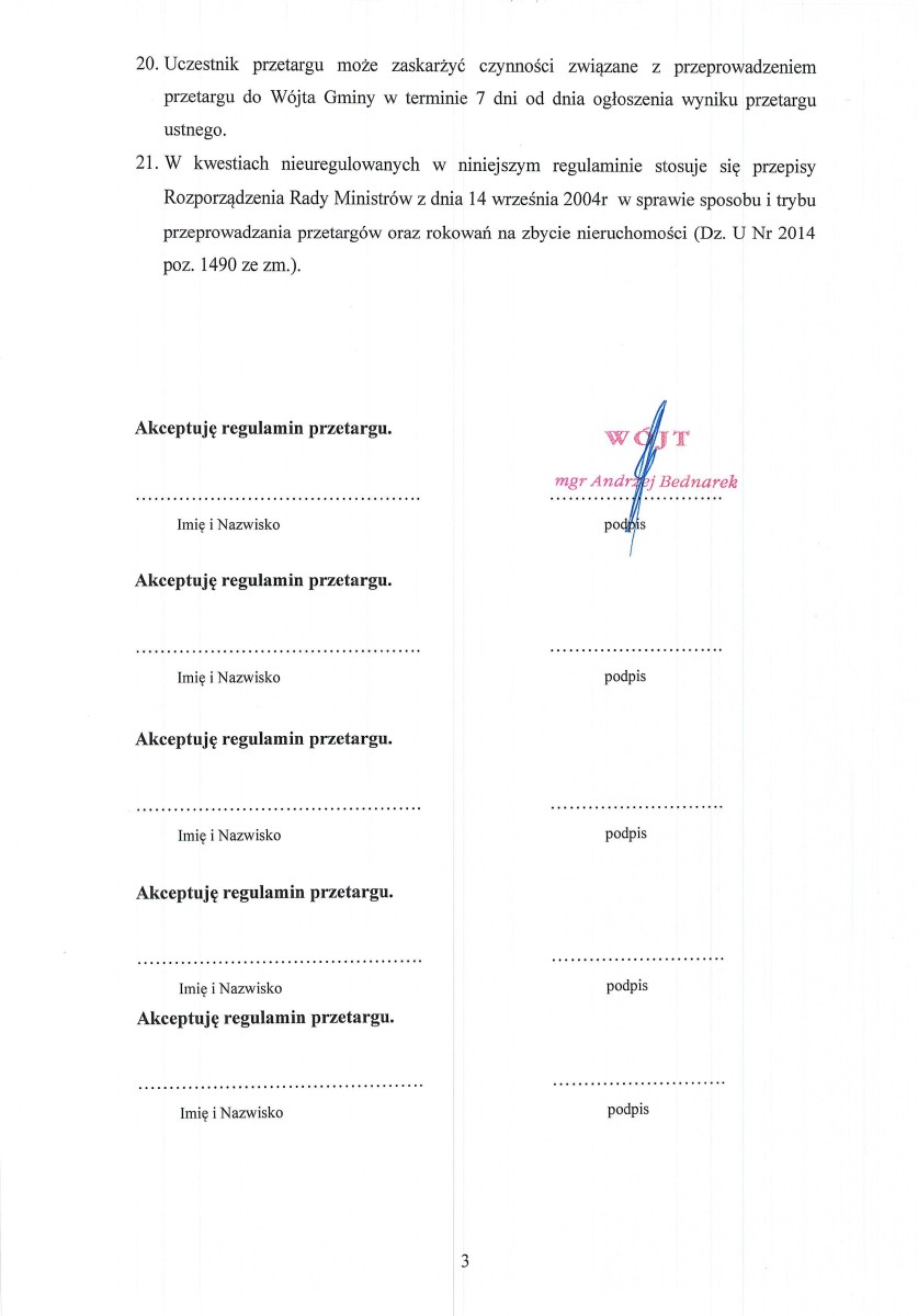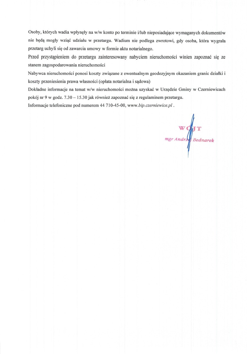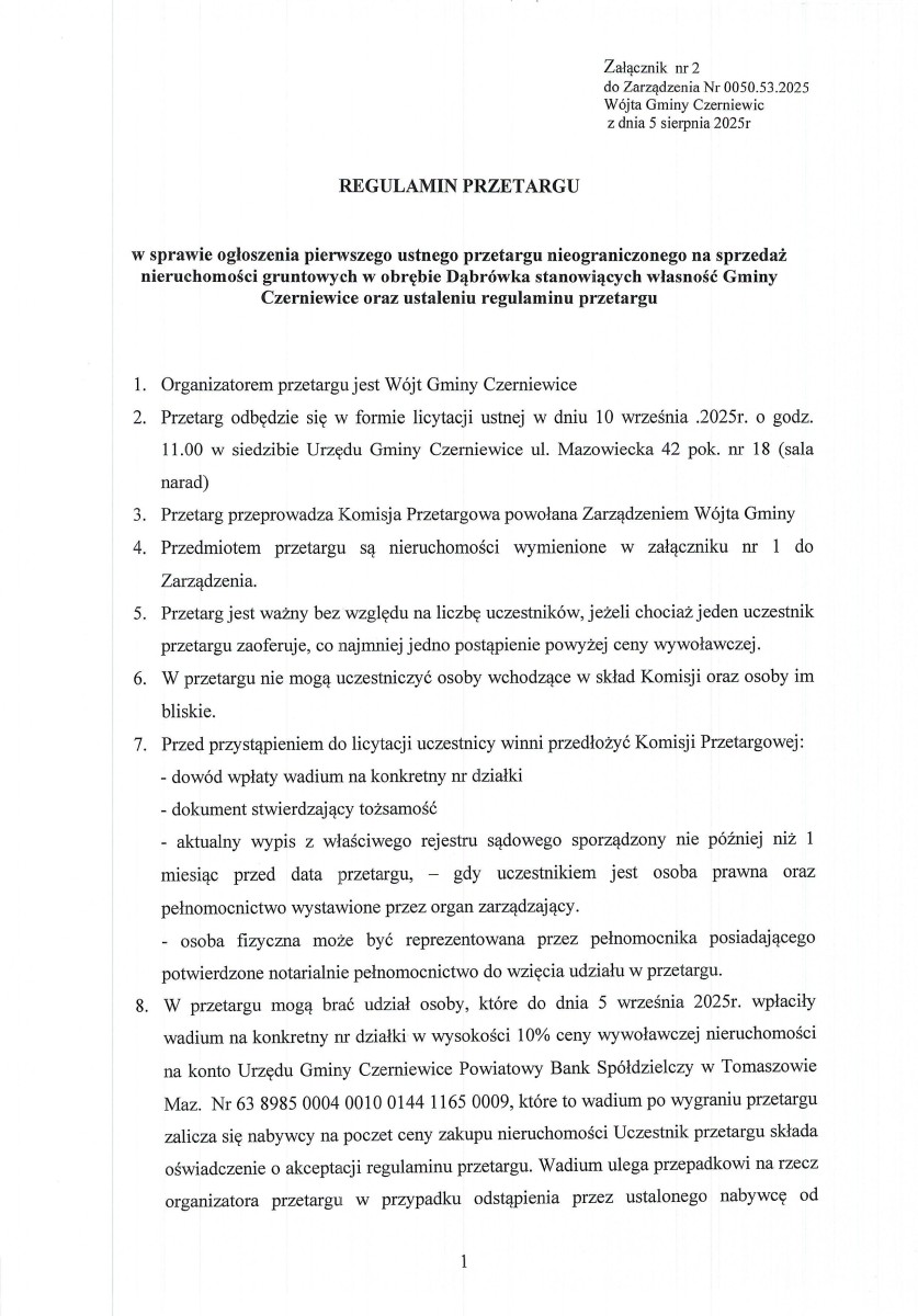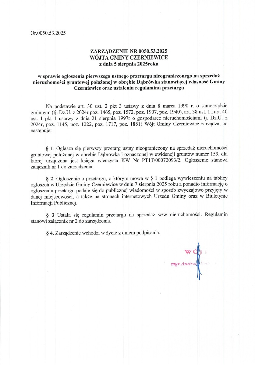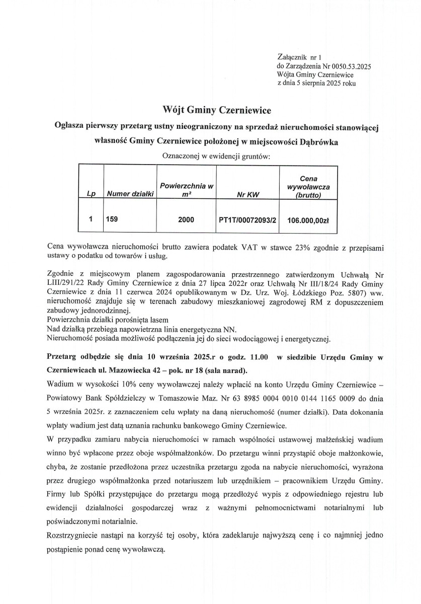 Ogłoszenie pierwszego ustnego przetargu nieograniczonego na sprzedaż nieruchomości gruntowej położonej w obrębie Dąbrówka stanowiącej własność Gminy Czerniewice