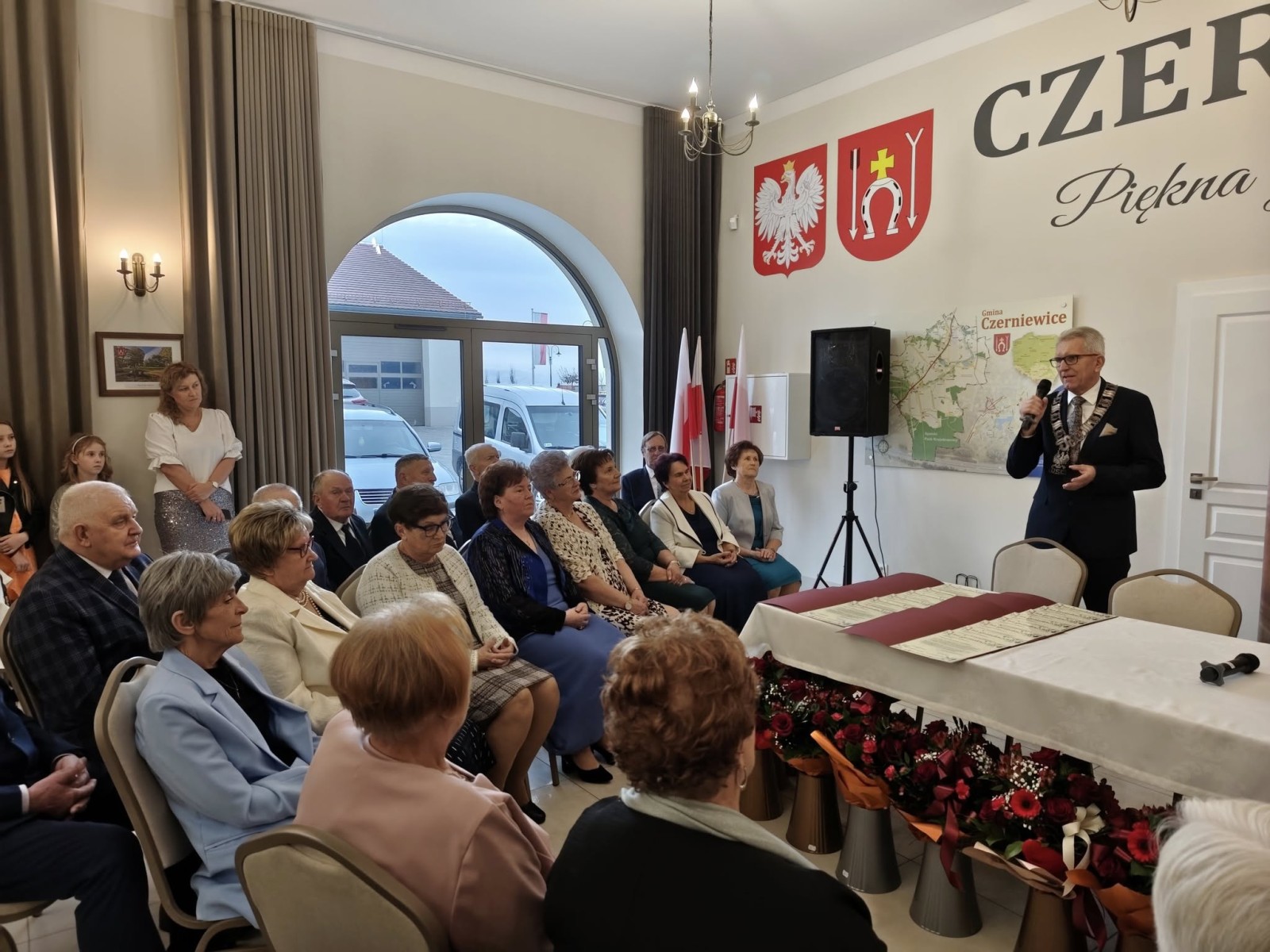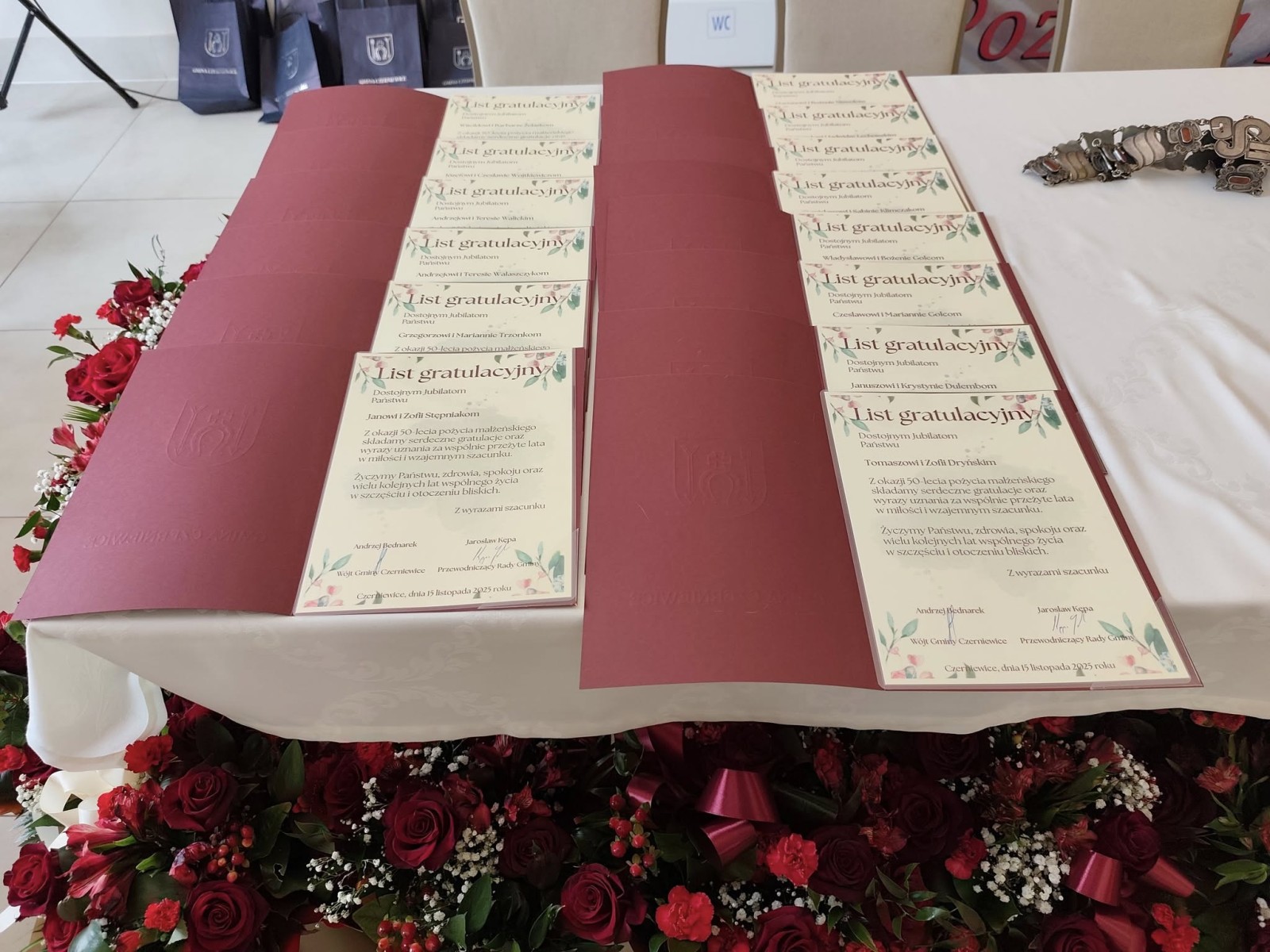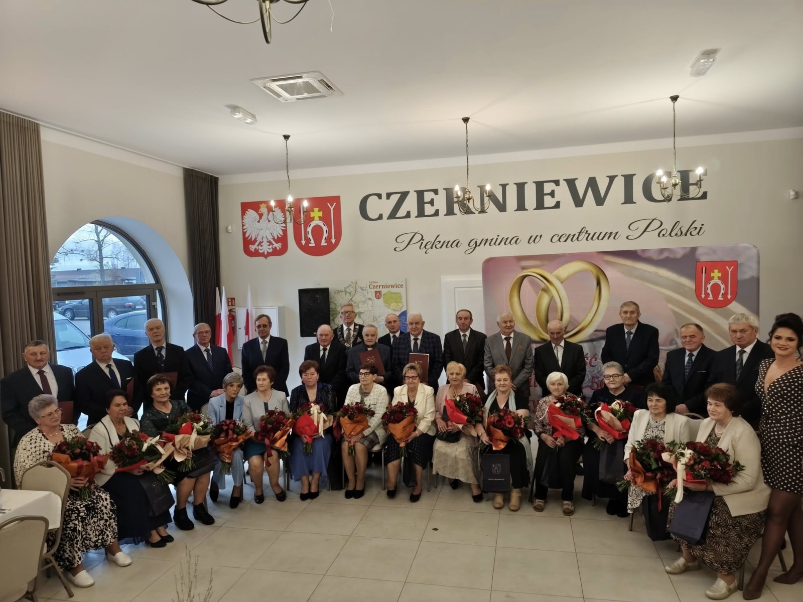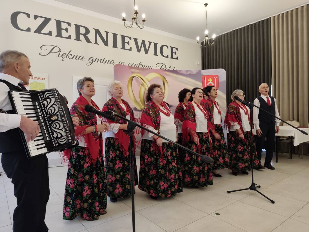 W minioną sobotę w Miejscu Spotkań i Rekreacji odbyła się uroczystość 50-lecia pożycia małżeńskiego. Tego zacnego jubileuszu doczekali i przybyli go świętować: Zofia i Tomasz Dryńscy z Czerniewic, Krystyna i Janusz Dulembowie z Wielkiej Woli, Bożena i Władysław Golcowie z Annowa, Marianna i Czesław Golcowie z Czerniewic, Sabina i Stanisław Klimczakowie ze Stanisławowa Studzińskiego, Grażyna i Józef Kozłowscy z Czerniewic, Jadwiga i Ryszard Lechowscy z Podkonic Miejskich, Bożena i Marian Niewolowie z Czerniewic, Zofia i Jan Stępniakowie ze Stanisławowa Lipskiego, Marianna i Grzegorz Trzonkowie z Annowa, Teresa i Andrzej Walaszczykowie z Annowa, Teresa i Andrzej Waliccy ze Studzianek, Czesława i Józef Wojtkiewiczowie z Czerniewic, oraz Barbara i Witold Żelazkowie z Wielkiej Woli. Przybyłym jubilatom towarzyszyły rodziny, a sala wypełniła się gośćmi jak nigdy dotąd. Gości powitała Emilia Wiśnik, kierownik USC w Czerniewicach. Podziękowała jubilatom za godne i długie pożycie małżeńskie oraz życzyła im zdrowia, radości i kolejnych lat spędzonych razem. Do życzeń przyłączyli się wójt Andrzej Bednarek i Jarosław Kępa – przewodniczący Rady Gminy Czerniewice. Dla uczestników uroczystości wystąpił zespół Czerniewiczanie, a później odbył się poczęstunek z lampką szampana i tortem. Sobotnie popołudnie upłynęło w miłej i podniosłej atmosferze. Jubilatom jeszcze raz serdecznie gratulujemy!
