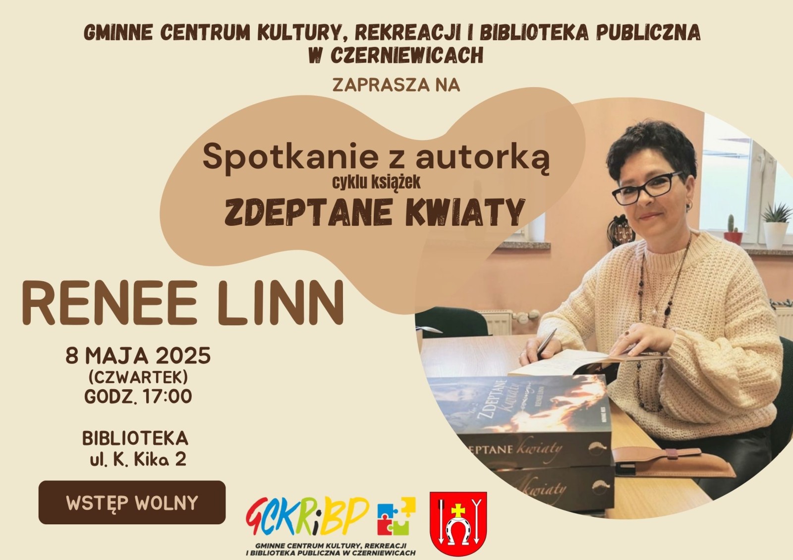 8 maja o godz. 17:00 w Gminnym Centrum Kultury, Rekreacji i Bibliotece Publicznej w Czerniewicach odbędzie się spotkanie autorskie z Renee Linn.