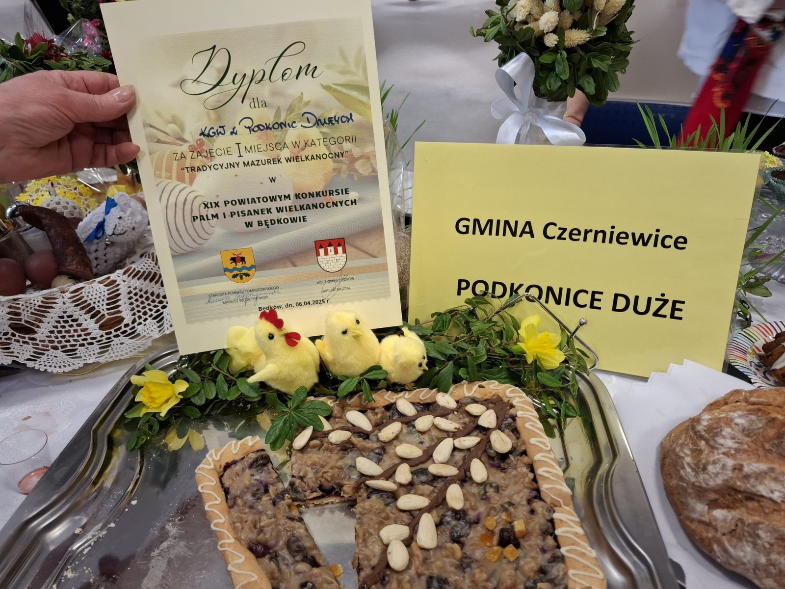 Reprezentujące gminę Czerniewice, Koło Gospodyń Wiejskich z Podkonic Dużych zdobyło pierwsza nagrodę w kategorii ,,Mazurek tradycyjny" na XIX Powiatowym Konkursie Palm i Pisanek Wielkanocnych w Będkowie. Święta Wielkiej Nocy, okres wiosennego pobudzenia do życia oraz radość z zakończenia okresu Wielkiego Postu, to w tradycji polskiej wsi czas sprzyjający wielu charakterystycznym obrzędom sięgającym swoimi korzeniami kilka wieków wstecz. Jednym z najbardziej charakterystycznych elementów okresu wielkanocnego są pisanki, palmy oraz mazurki.