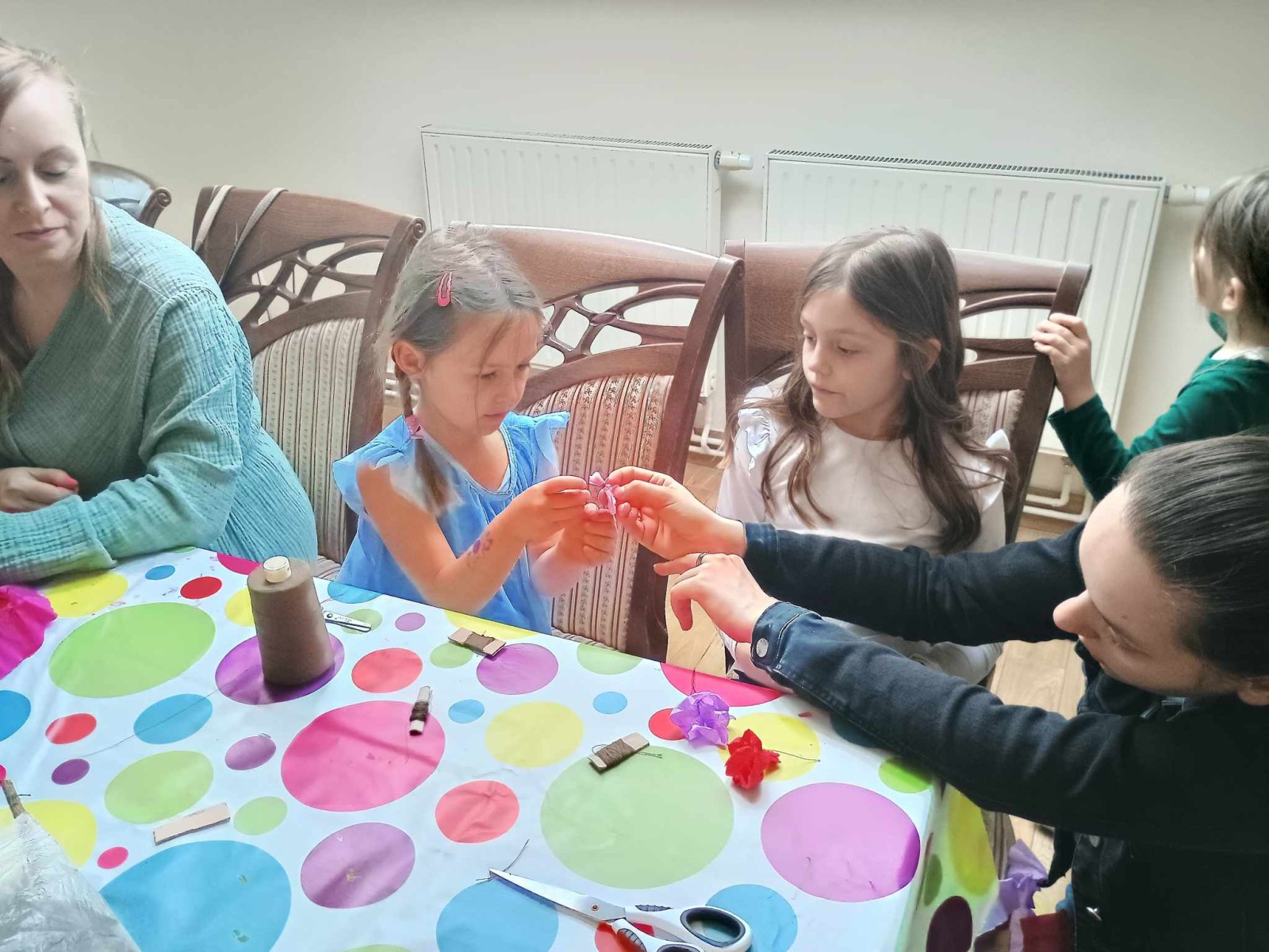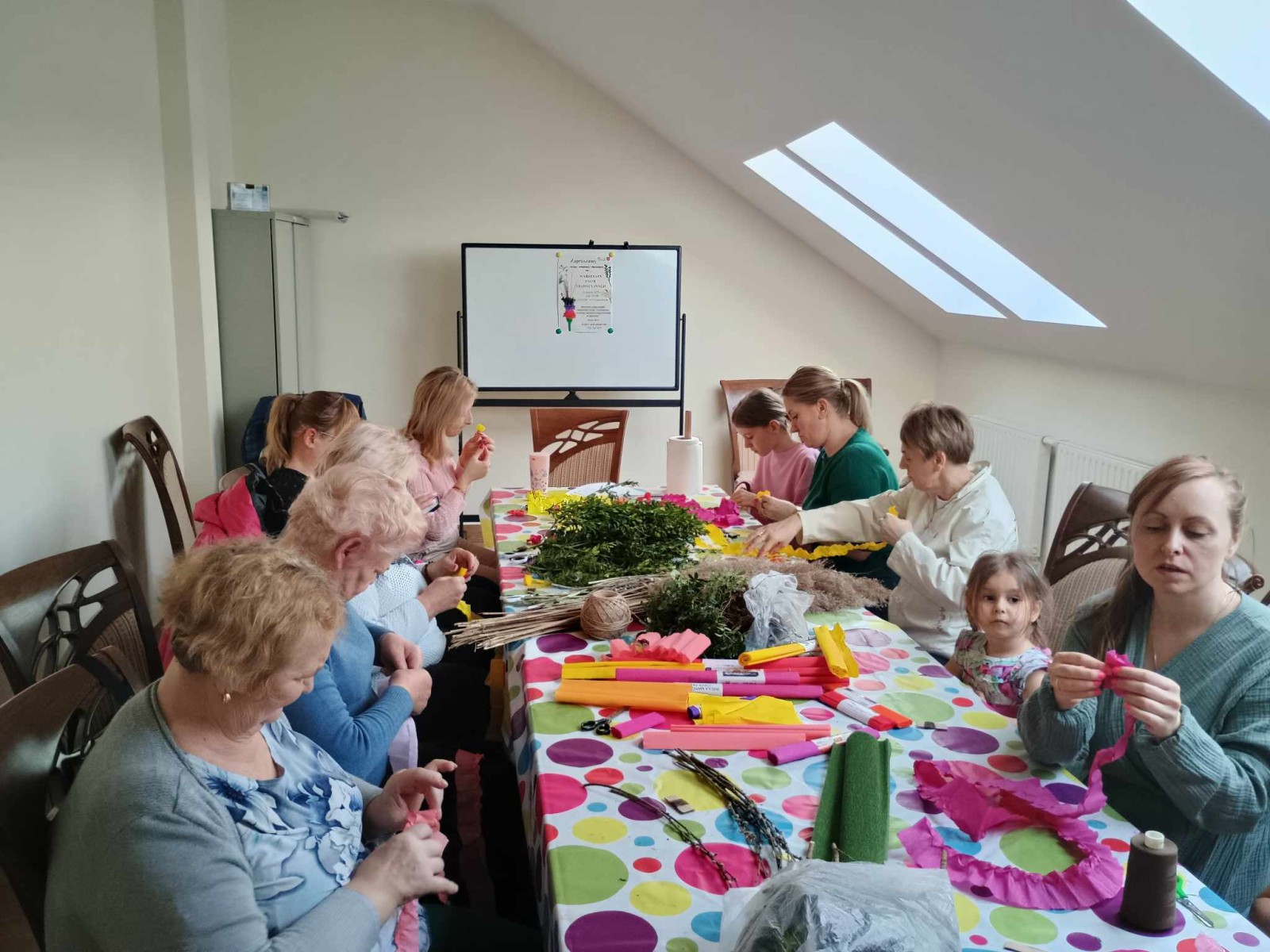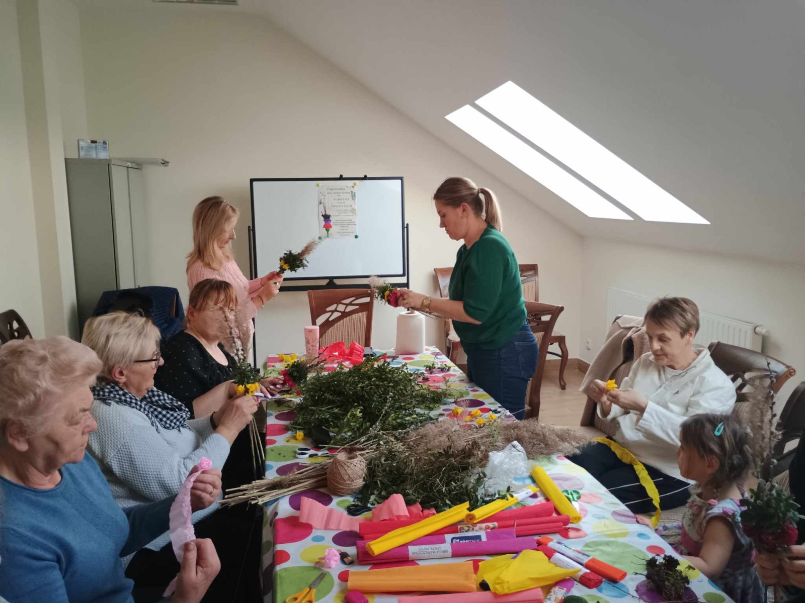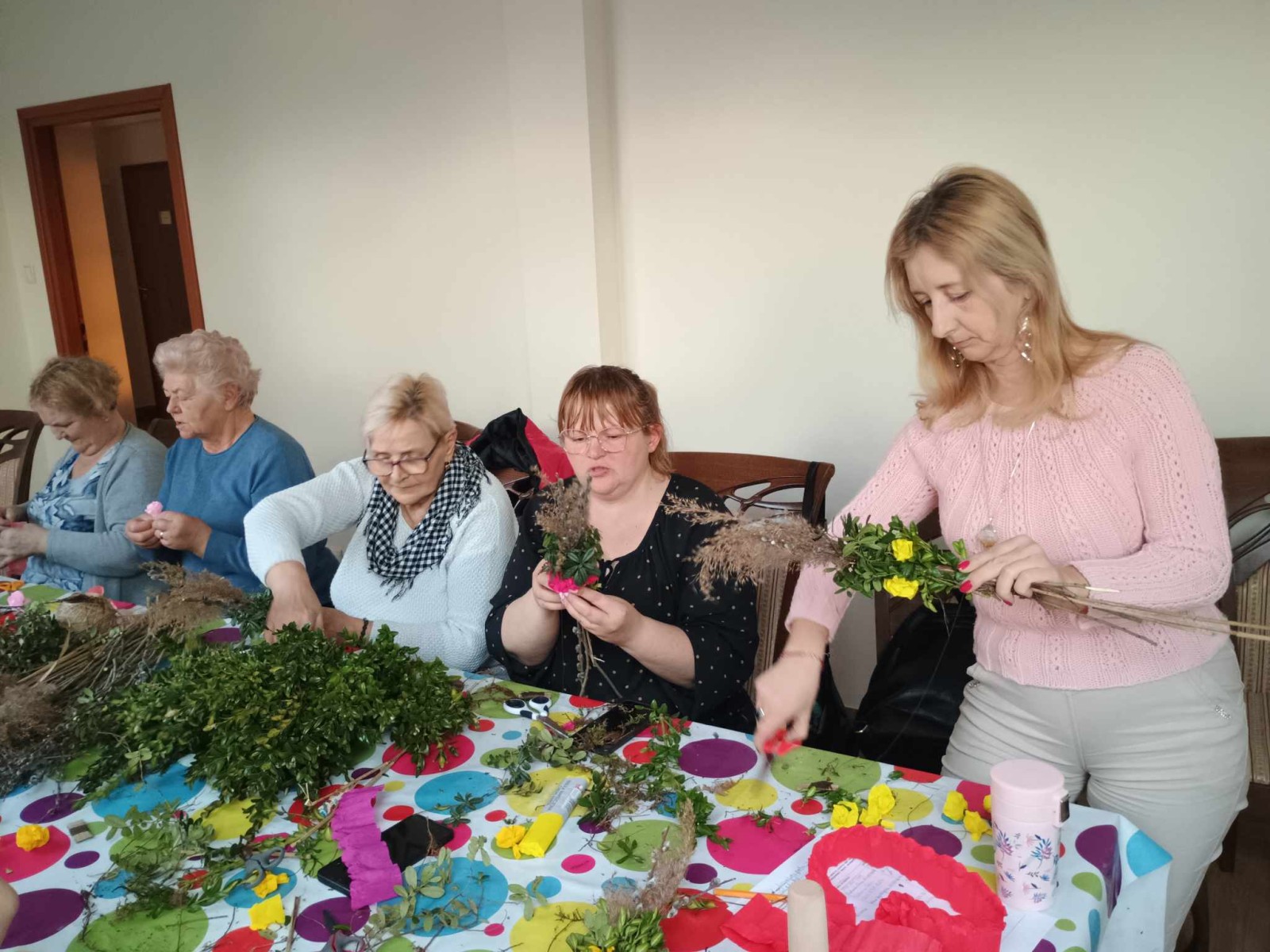 W piątkowe popołudnie ponownie odwiedziła nas pani etnolog Aleksandra Grad - Rychwalska z Muzeum Regionalnego w Opocznie. A to dlatego, abyśmy mogli dowiedzieć się czym charakteryzuje się tradycyjna palma wielkanocna. Wykonując ją dzieci i dorośli mogli przekonać się z czego się składa. Obok trzciny i gałązek wierzby elementami obowiązkowymi okazały się być leśna borówka, kwiaty z kolorowej bibuły oraz biała wstążka – służąca do zawinięcia dolnej części palmy oraz do stworzenia dekoracyjnej kokardy.
