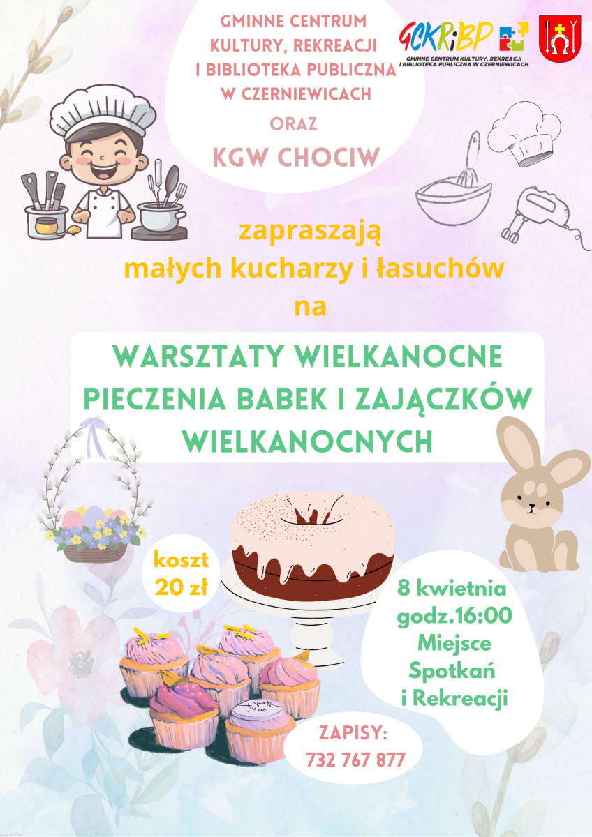 Razem z KGW Chociw zapraszamy dzieci do udziału w warsztatach pieczenia babek, babeczek i zajączków wielkanocnych w najbliższy wtorek 8 kwietnia o godzinie 16:00 w Miejscu Spotkań i Rekreacji. Obowiązują zapisy pod numerem: 732 767 877
