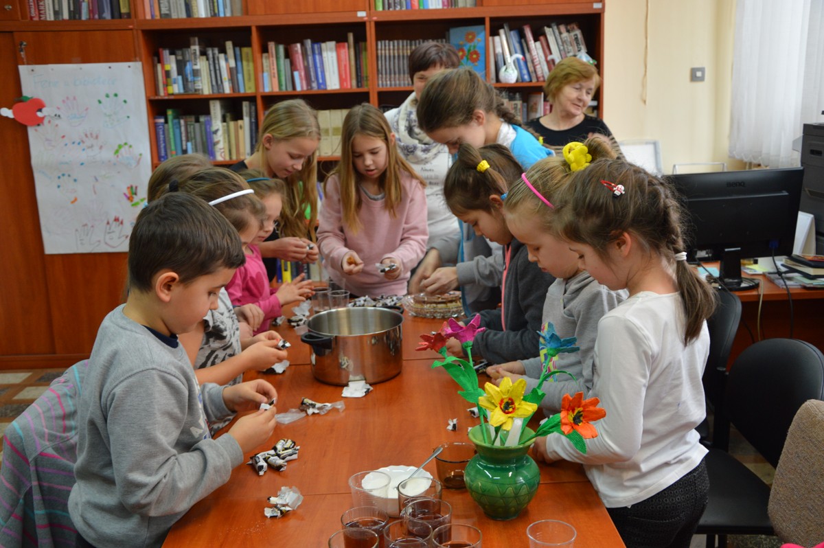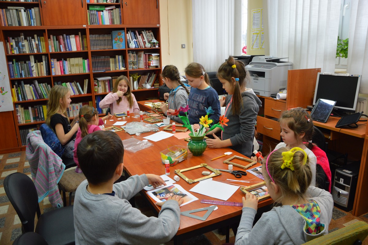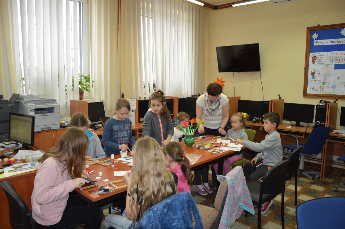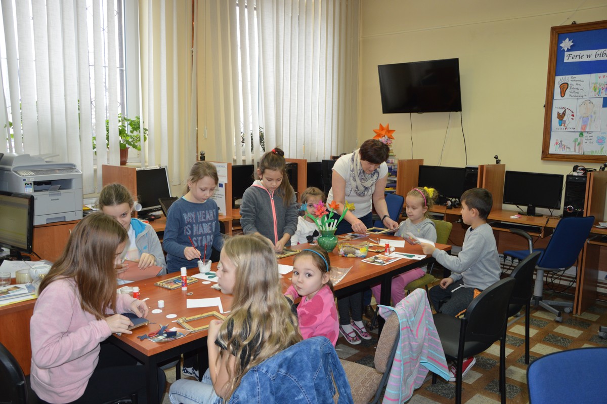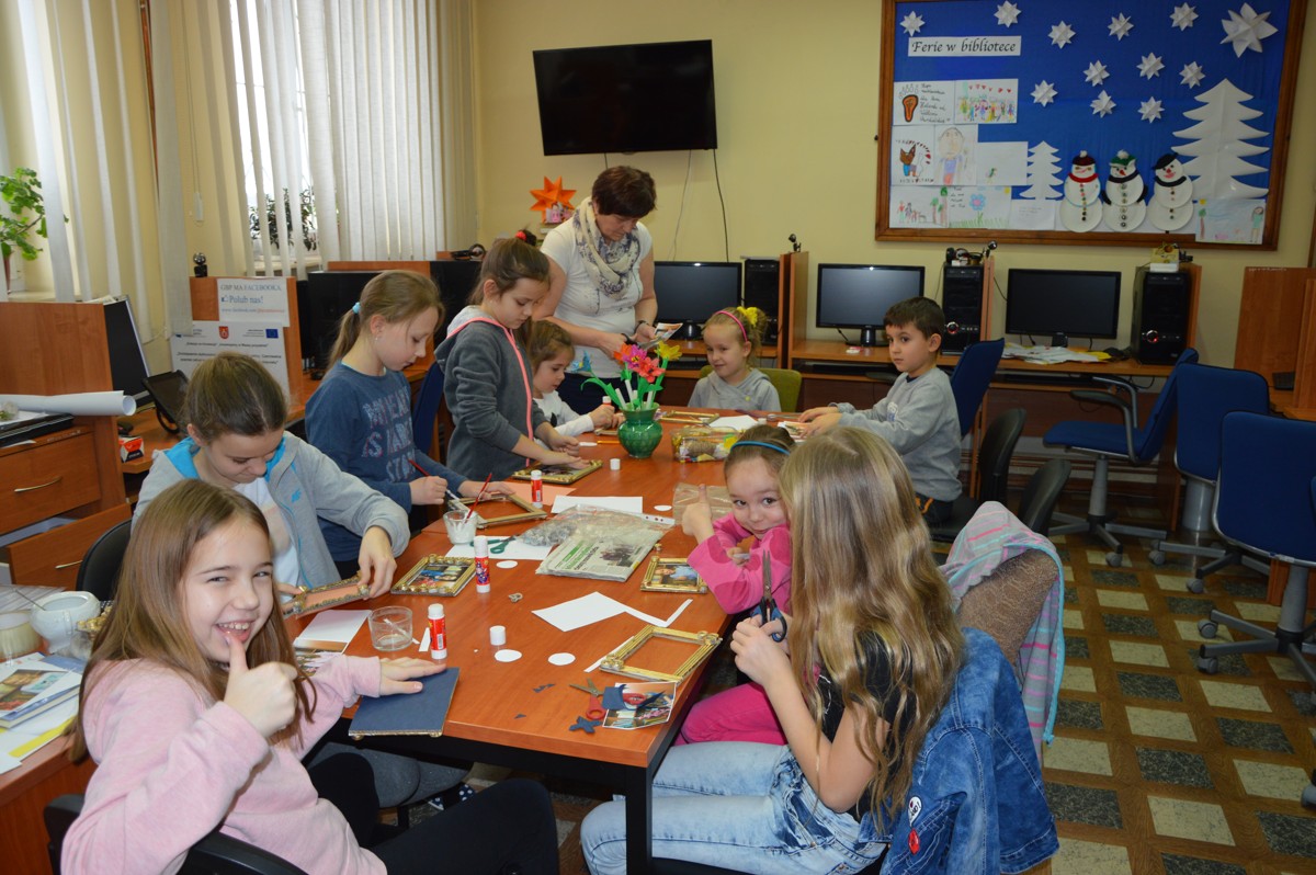 Ferie w bibliotece za nami. Zajęcia w bibliotece odbywały się od 16 do 20 stycznia 2017 r. w godz. 11:00 do 15:00. Dzieci codziennie przybiegały do biblioteki z uśmiechem na twarzy oczekując nowej propozycji zabawy. Podczas spotkań organizowane były różne formy pracy między innymi zabawy edukacyjne, ruchowe, plastyczne oraz kulinarne. Czytane książki były inspiracją do naszej pracy i zabawy. Na podstawie książki Ewy Nowak „Szarka”, dzieci nauczyły się rozpoznawać tropy zwierząt i była to ulubiona zabawa przez całe ferie. W programie były warsztaty plastyczne, podczas których wykonywane zostały kwiatki, ramki ze zdjęciami dla babci i dziadka, bałwanki oraz pingwinki z lodowej krainy. Oprócz tego uczestnicy chętnie rysowali, malowali oraz rozwiązywali krzyżówki i rebusy do przeczytanych książek. Dzieci własnoręcznie zrobiły słodkie szyszki, które ładnie zapakowane były kolejną niespodzianką dla babć i dziadków. Nie zabrakło codziennie słodkiego poczęstunku. Zajęcia odbywały się bezpłatnie. Podejmowane działania umożliwiły przyjemne i pożyteczne spędzenie czasu w bibliotece.