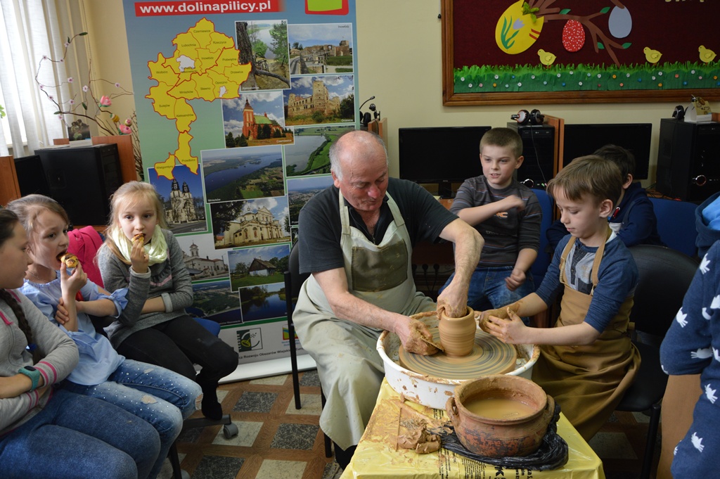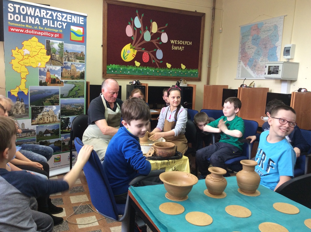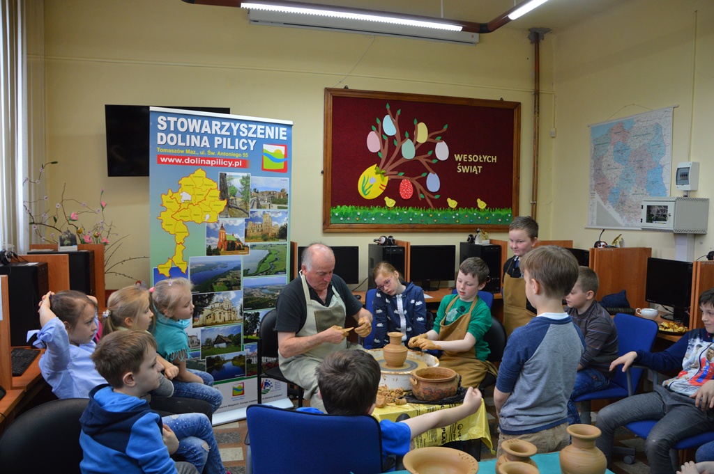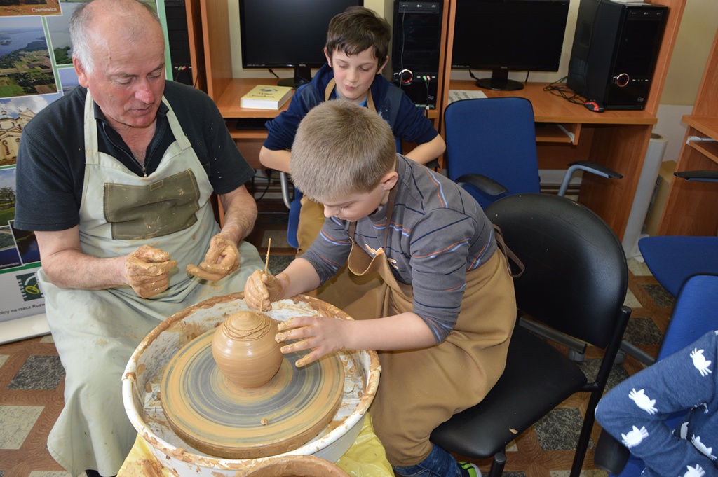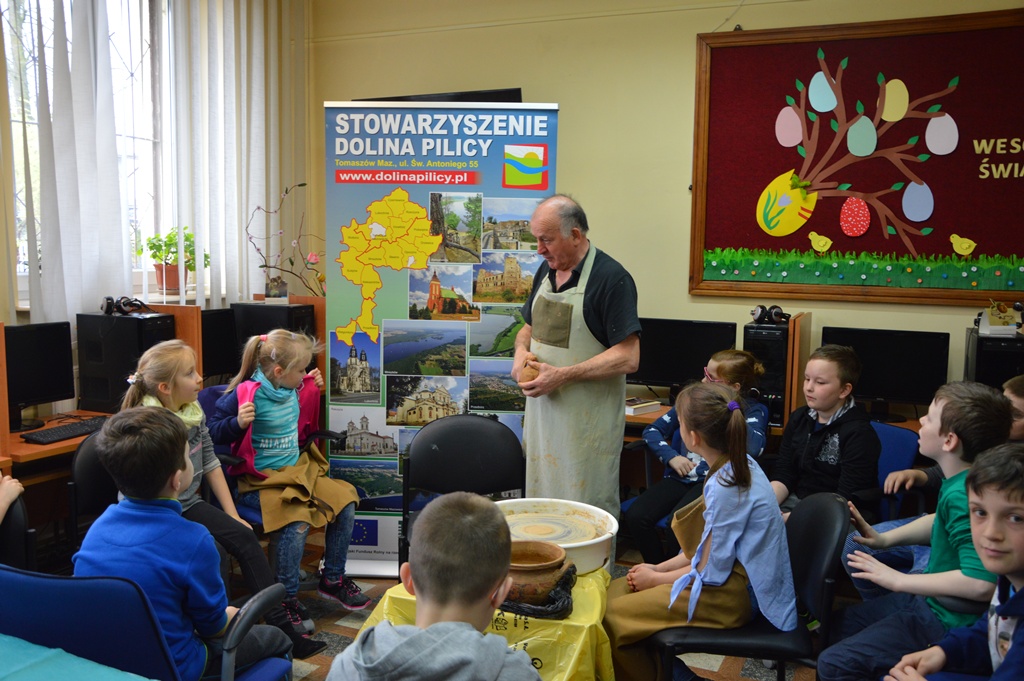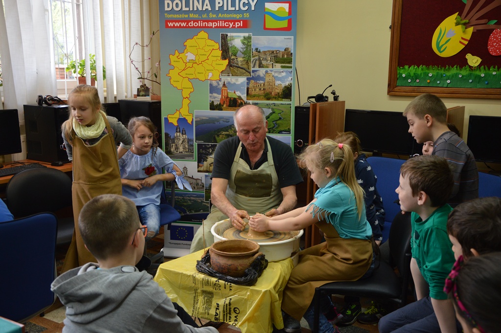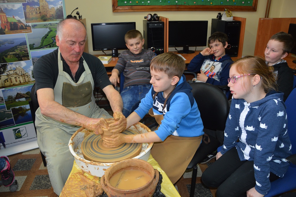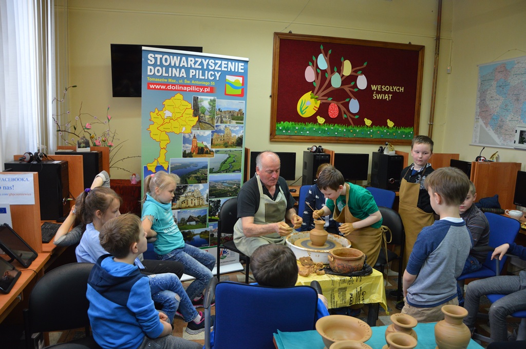 6 kwietnia br. w Gminnej Bibliotece Publicznej w Czerniewicach odbyły się warsztaty garncarstwa, które prowadził Ryszard Arkuszyński z Człuchowa, woj. pomorskie. Wprowadzeniem do zajęć była książka "Młyn na Stawkach" Krystyny Wieczorek. Prowadzący urodził się w gminie Sulejów, więc lubi wracać w rodzinne strony. Wiedza na temat wykonywania wyrobów ceramicznych, jak również umiejętność tworzenia naczyń na kole garncarskim przekazywana była w jego rodzinie z pokolenia na pokolenie. Uczestnikami zajęć były dzieci, ale swoich sił spróbowali i dorośli. Dzieci z ogromnym zainteresowaniem słuchały garncarza, który ciekawie opowiadał nie tylko o swojej pracy. W trakcie zajęć praktycznych, przy pomocy mistrza powstało wiele cudnych wyrobów z gliny. Wszyscy mogli doświadczyć tego wspaniałego wrażenia, kiedy spod ich rąk wychodziły niesamowite naczynia, niepowtarzalne wazoniki, miski czy skarbonki. Wykonane prace prawie tydzień suszyły się w bibliotece, więc można je było podziwiać. Profesjonalizm, bezpośrednia komunikacja oraz poczucie humoru prowadzącego urzekło uczestników spotkania. Warsztaty na pewno na długo zostaną w pamięci uczestników, a zostały zorganizowane przez Stowarzyszenie Doliny Pilicy i współfinansowane ze środków Unii Europejskiej w ramach poddziałania 19.4 "Wsparcie na rzecz kosztów bieżących i aktywizacji" Programu Rozwoju Obszarów Wiejskich na lata 2014-2020”.