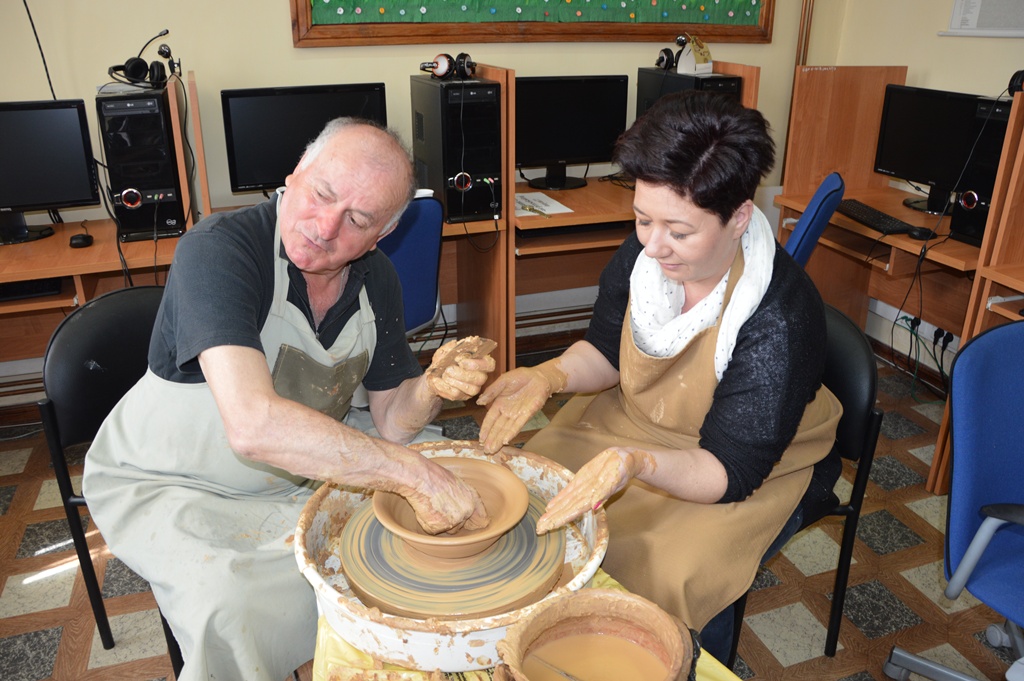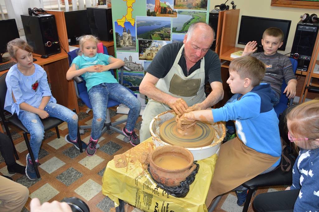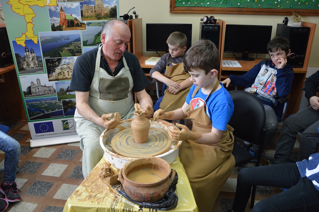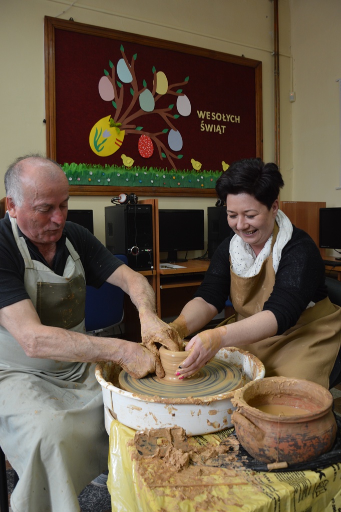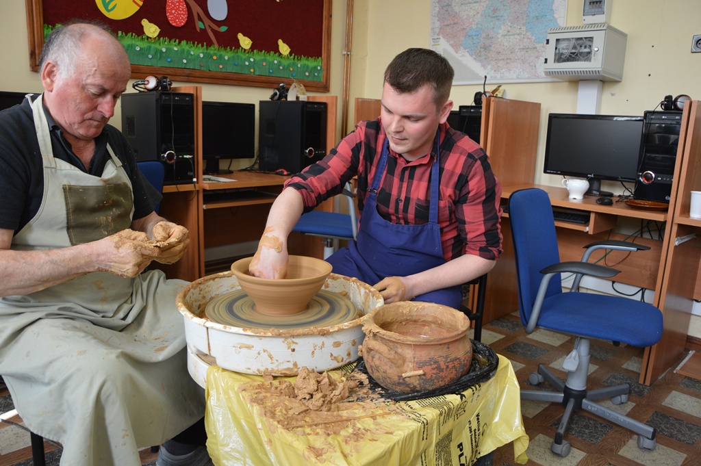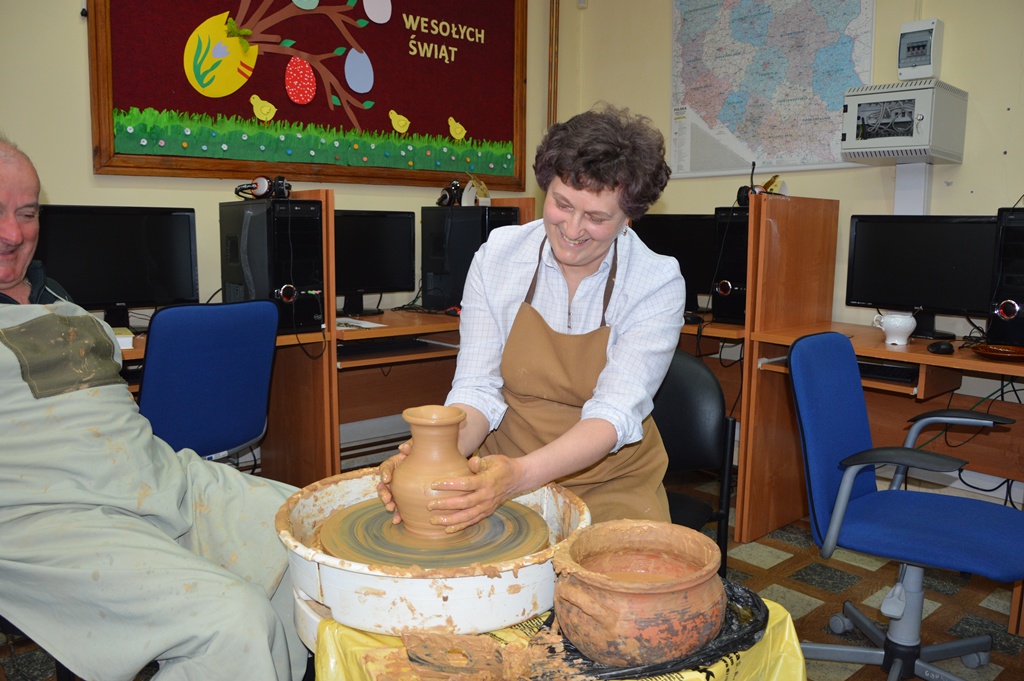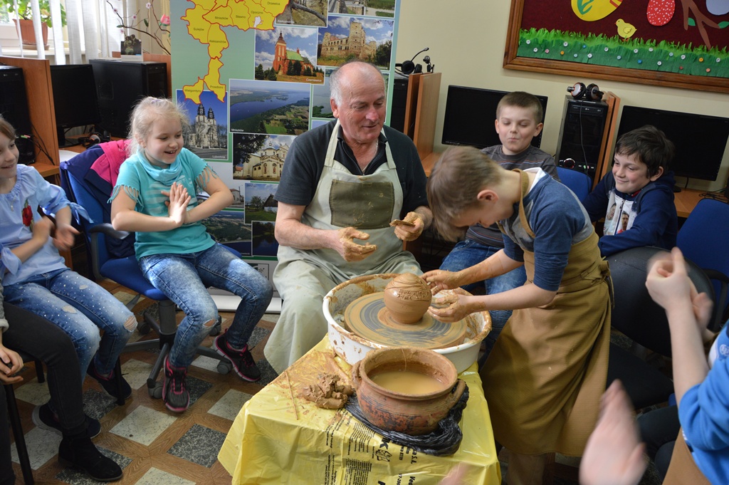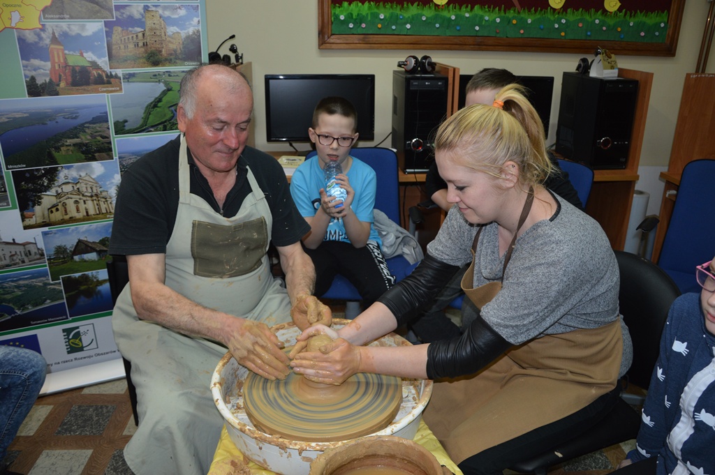 6 kwietnia br. w Gminnej Bibliotece Publicznej w Czerniewicach odbyły się warsztaty garncarstwa, które prowadził Ryszard Arkuszyński z Człuchowa, woj. pomorskie. Wprowadzeniem do zajęć była książka "Młyn na Stawkach" Krystyny Wieczorek. Prowadzący urodził się w gminie Sulejów, więc lubi wracać w rodzinne strony. Wiedza na temat wykonywania wyrobów ceramicznych, jak również umiejętność tworzenia naczyń na kole garncarskim przekazywana była w jego rodzinie z pokolenia na pokolenie. Uczestnikami zajęć były dzieci, ale swoich sił spróbowali i dorośli. Dzieci z ogromnym zainteresowaniem słuchały garncarza, który ciekawie opowiadał nie tylko o swojej pracy. W trakcie zajęć praktycznych, przy pomocy mistrza powstało wiele cudnych wyrobów z gliny. Wszyscy mogli doświadczyć tego wspaniałego wrażenia, kiedy spod ich rąk wychodziły niesamowite naczynia, niepowtarzalne wazoniki, miski czy skarbonki. Wykonane prace prawie tydzień suszyły się w bibliotece, więc można je było podziwiać. Profesjonalizm, bezpośrednia komunikacja oraz poczucie humoru prowadzącego urzekło uczestników spotkania. Warsztaty na pewno na długo zostaną w pamięci uczestników, a zostały zorganizowane przez Stowarzyszenie Doliny Pilicy i współfinansowane ze środków Unii Europejskiej w ramach poddziałania 19.4 "Wsparcie na rzecz kosztów bieżących i aktywizacji" Programu Rozwoju Obszarów Wiejskich na lata 2014-2020”.