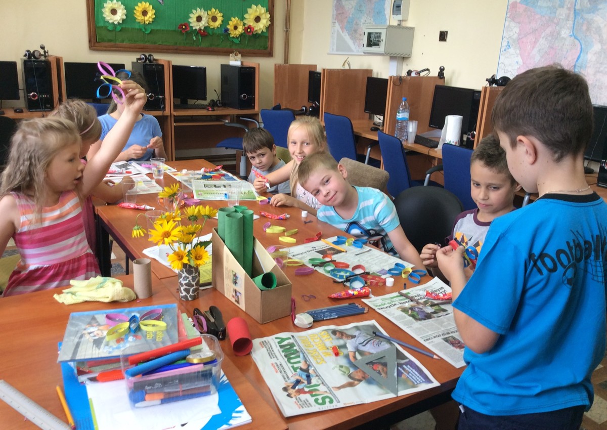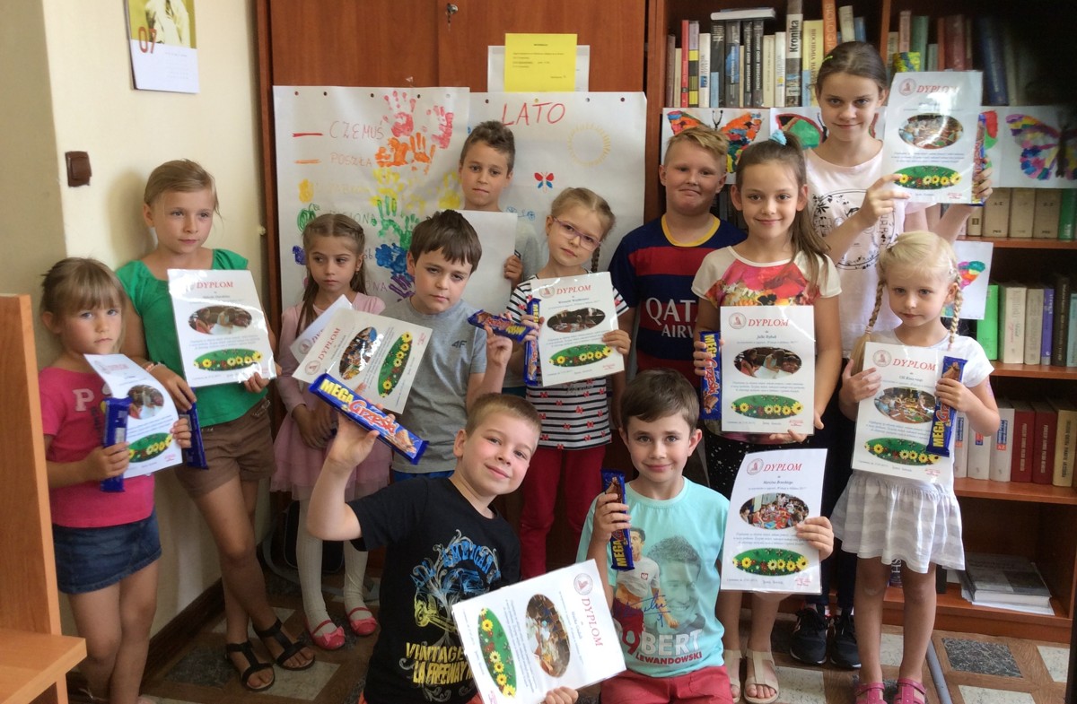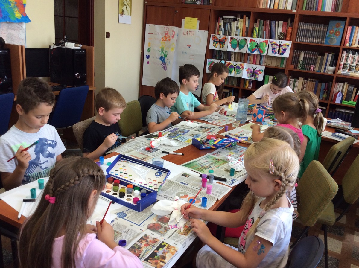 Zajęcia odbywały się w Gminnej Bibliotece Publicznej w Czerniewicach dwa razy w tygodniu od 13 do 27 lipca 2017 r. Celem spotkań było zorganizowanie czasu wolnego w sposób bezpieczny, ciekawy i pożyteczny. Biblioteka przygotowała różnorodne zajęcia, w tym edukacyjne z książką i zasad bezpieczeństwa w nternecie, warsztaty plastyczne oraz gry i zabawy. Motywem przewodnim w zajęciach plastycznych były kolory lata. W trakcie zajęć dzieci malowały motyle sposobem lustrzanym. Powstały piękne słoneczniki, symbole słońca oraz kolorowe motyle z rolek po papierze toaletowym i ptaki z serwetek. Tegoroczne lato w bibliotece było bardzo kolorowe. Dzieci chętnie z wielkim zapałem malowały zarówno indywidualnie jak i zespołowo. Prace wspólnie wykonane można podziwiać w bibliotece, pozostałe zostały zabrane przez uczestników. W domach na dziecięcych biurkach pojawiły kolorowe przyborniki, również wykonane samodzielnie. Każde spotkanie kończyło się grą na komputerach i tabletach. Nie zabrakło też słodkiego poczęstunku. Na zakończenie wszyscy otrzymali dyplomy i słodki upominek. Zajęcia w bibliotece były okazją do zdobywania nowych doświadczeń, nawiązania nowych kontaktów oraz fajnej zabawy. Wszystkim dzieciom dziękujemy za aktywny udział, ciekawe pomysły i radość wniesioną w nasze spotkania.