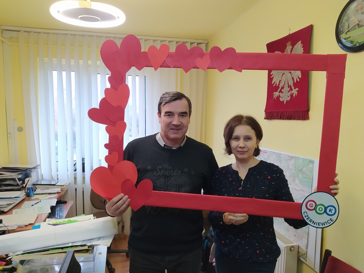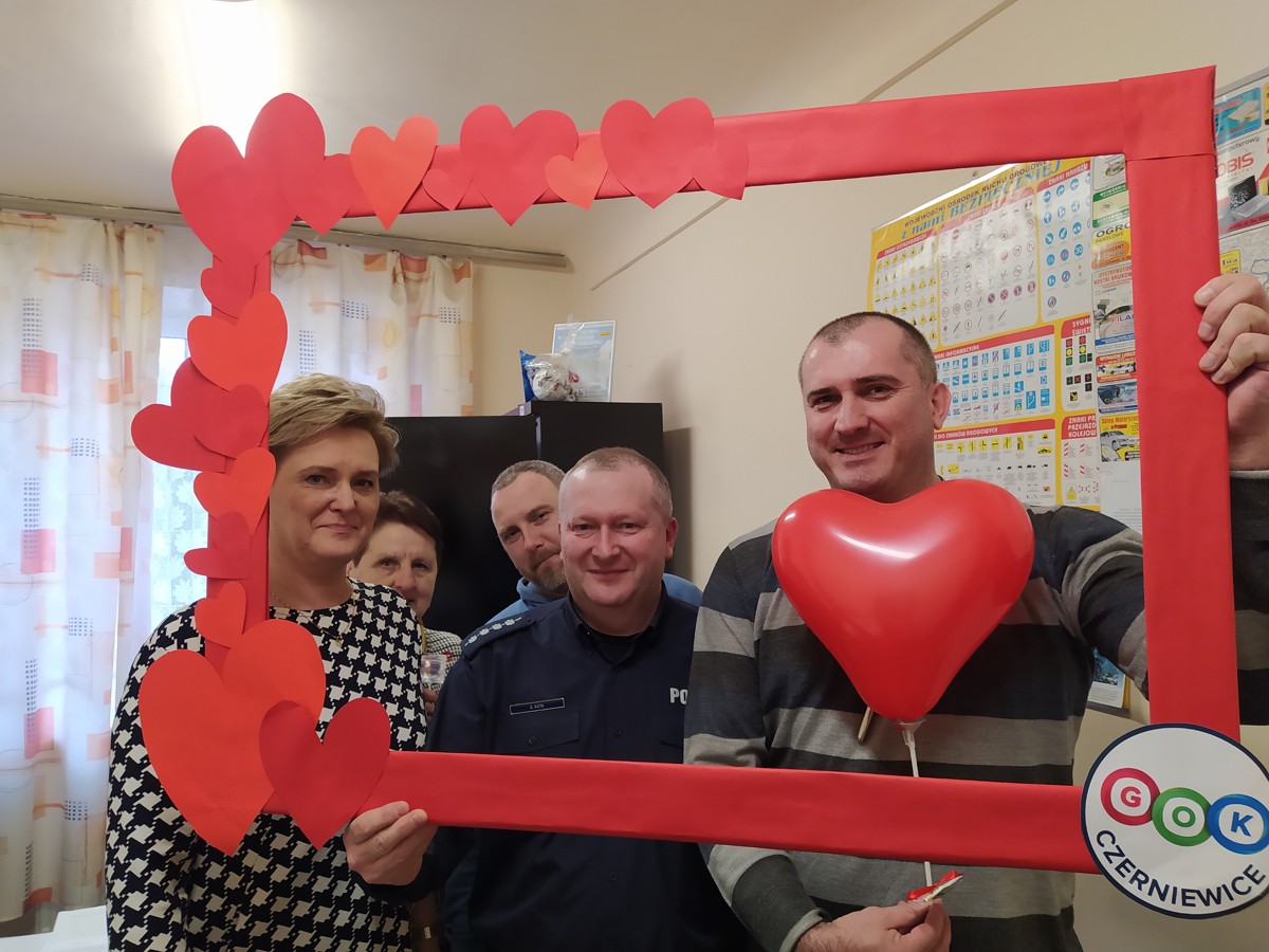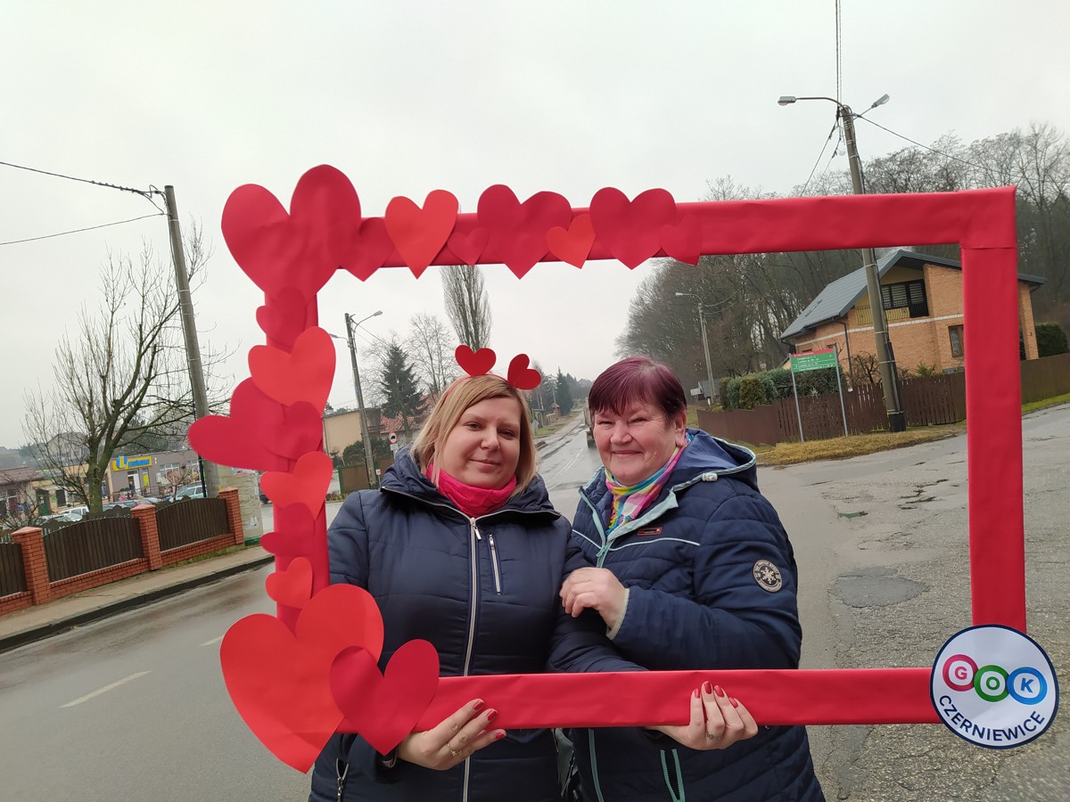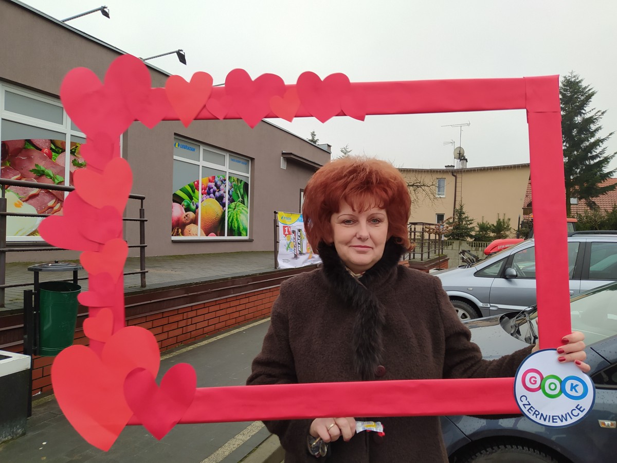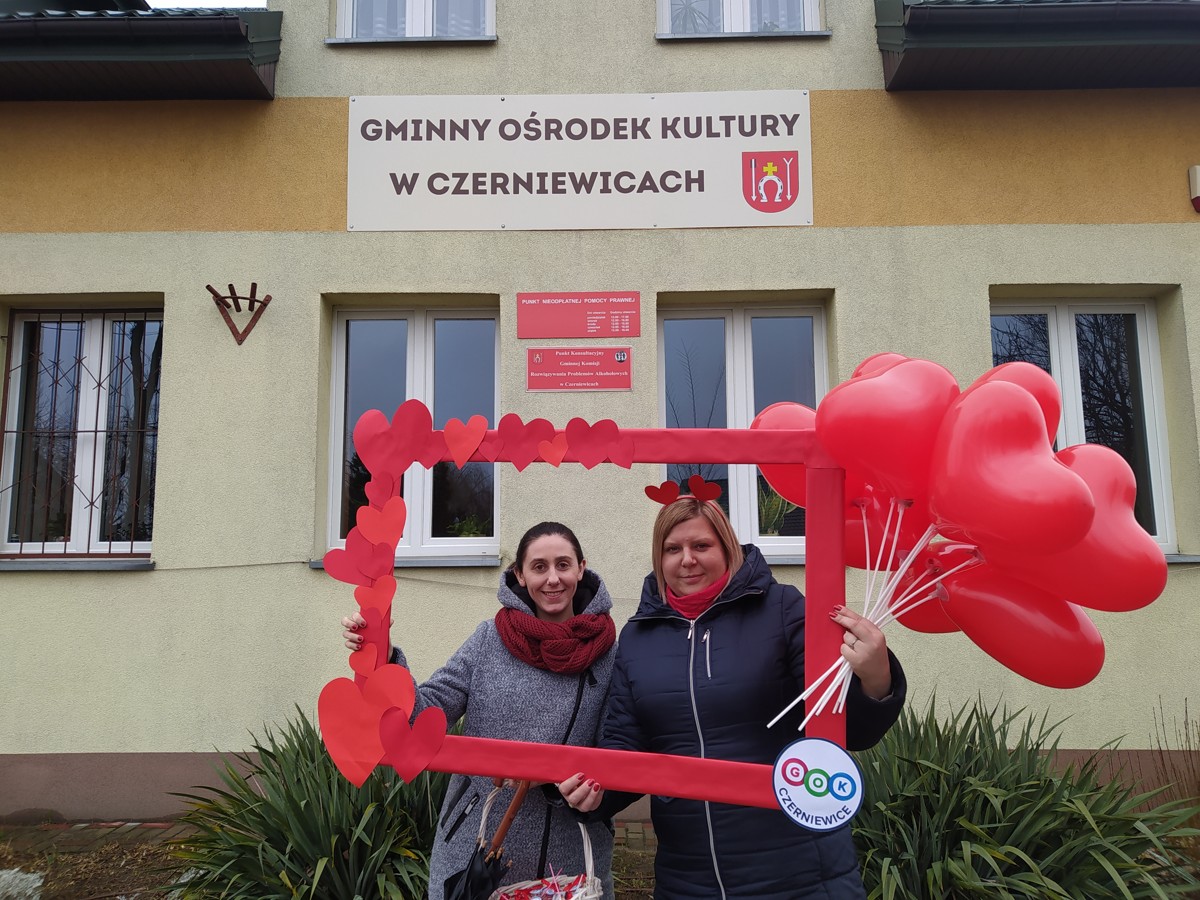 Gminny Ośrodek Kultury w tym roku zaskoczył mieszkańców Czerniewic. Z balonami w kształcie serc, czerwonymi lizakami i walentynkową ramką do zdjęć pracownicy ośrodka przemierzali ulice gminy. Słodkimi upominkami częstowali wszystkich przechodniów oraz zapraszali do zrobienia pamiątkowego zdjęcia. Odwiedzili też Urząd Gminy, Policję, GOPS, Pocztę, GOZ, aptekę, kwiaciarnię, lokalne sklepy i przedsiębiorców. Walentynkowa akcja bardzo spodobała się wszystkim mieszkańcom, którzy odwdzięczali się dobrym słowem i ciepłym uśmiechem.