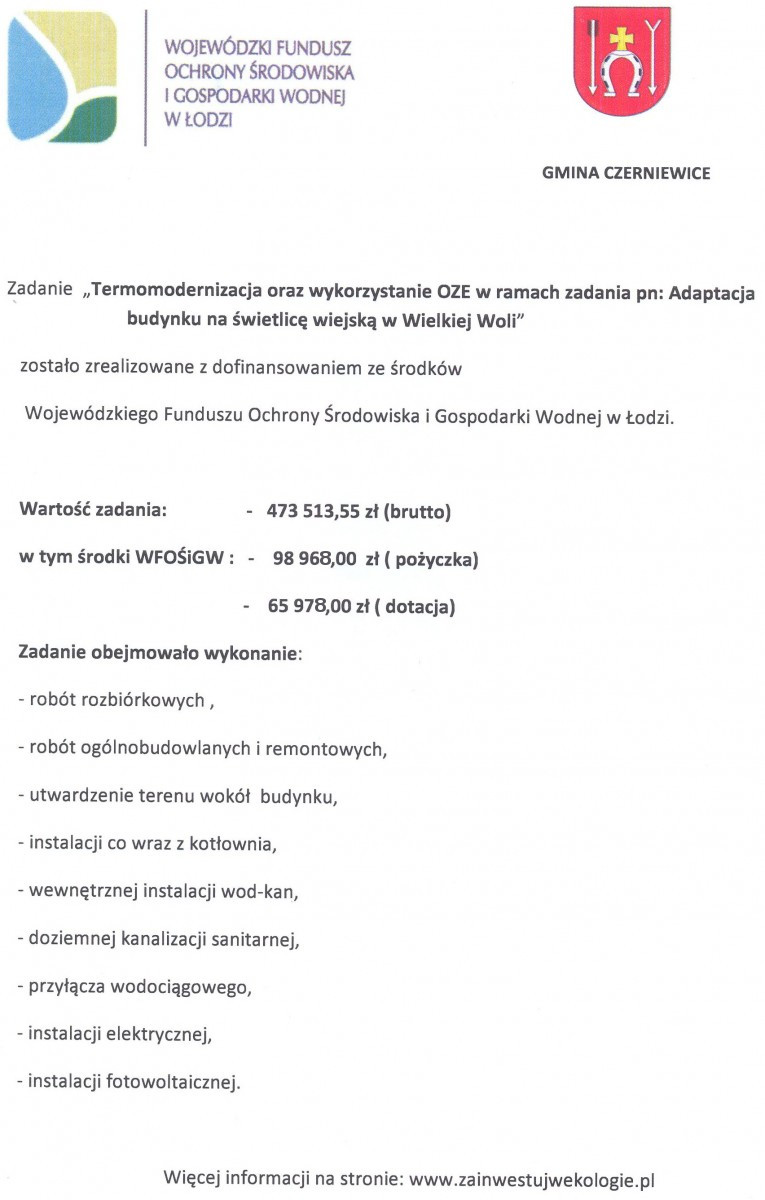 Termomodernizacja oraz wykorzystanie OZE w ramach zadania pn: Adaptacja budynku na świetlicę wiejską w Wielkiej Woli