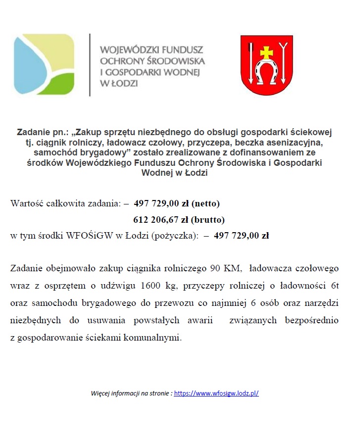 Zakup sprzętu niezbędnego do obsługi gospodarki ściekowej tj. ciągnik rolniczy, ładowacz czołowy, przyczepa, beczka asenizacyjna, samochód brygadowy” zostało zrealizowane z dofinansowaniem ze środków Wojewódzkiego Funduszu Ochrony Środowiska i Gospodarki